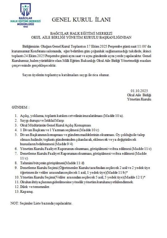 Bağcılar Halk Eğitimi Merkezi Müdürlüğü Okul Aile Birliğinin Olağan Genel Kurul toplantısı 17 Ekim 2025 Cuma Günü saat 14.30'da, yeterli çoğunluk sağlanamadığı durumda ise 24 Ekim 2025 Cuma Günü saat 14.30'da, Merkezimizin Konferans Salonunda yapılacaktır.